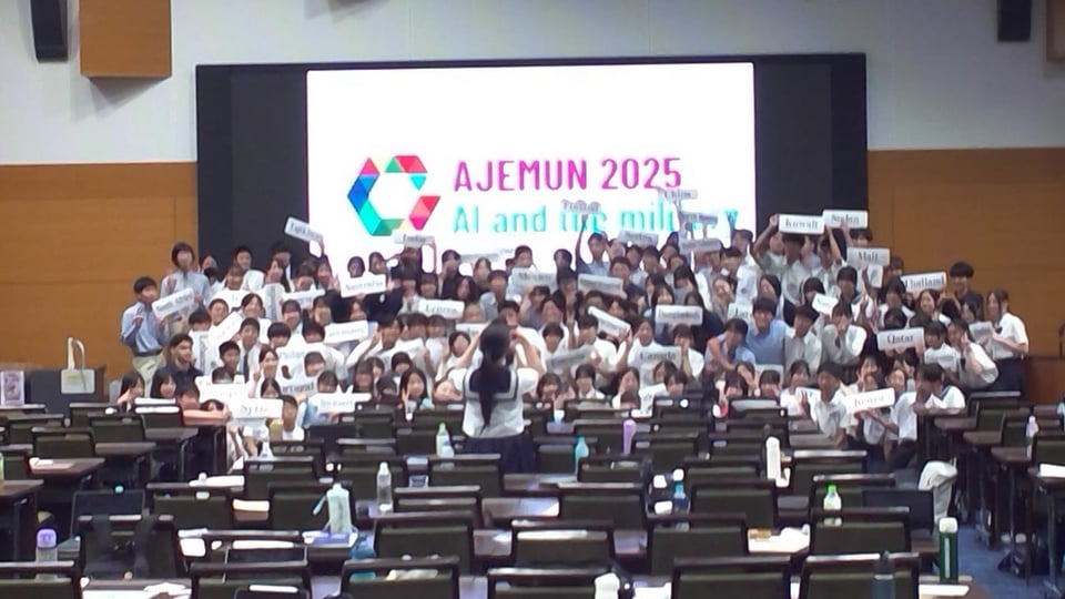 AJEMUNは、「だれでも参加できる全国規模の模擬国連大会」という目的のもと、毎年8月に2日間に渡って開催されている会議です。今年の会議は8月4日・5日に、国立オリンピック記念青少年総合センターで行われました。本校からは、高校2年生3名と、1年生2名が参加しました。