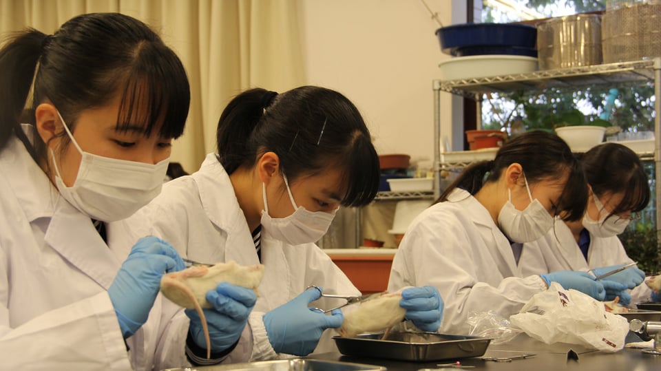 今年度からは理数教育に力を入れていますが、特に理科(生物)は実物主義、校舎を一歩出れば動植物の宝庫です。高3の生物の授業の集大成は解剖です。ブタの脳みそと眼球と心臓、胎児、ラットの解剖が行われました。ブタの眼球は一人一つずつ割り当てられ、ラットも一人一匹です。