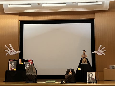 また、有志生徒が約1ヶ月かけて制作した怖い舞台装飾も会場の雰囲気をゾッと盛り上げてくれました。話がひとつまたひとつと終わる度に外から会場にこぼれてくる光が薄れてゆき、終盤にさしかかる頃には会場が真っ暗になっていたのもまた一興でした。話が始まるとある教員の水晶の数珠がはじけ飛んだり、トイレで何かを見たという生徒がいたりと、まぁそういうこともあるだろうなという報告もありました。