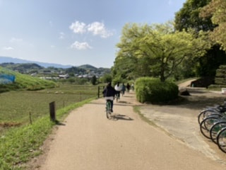 2日目の午前は談山神社、安倍文殊院をお参りしました。安倍文殊院では、学業成就の御祈祷もしていただきました。また、事前に学習した仏像を目の当たりにし、それぞれに順番に、丁寧に手を合わせる様子がうかがえました。午後は飛鳥地方の班別自主研修。日差しも強まり絶好のサイクリング日和となり、爽快な風を受け解放感に浸りながら、それぞれの興味に沿って計画した地を巡りました。