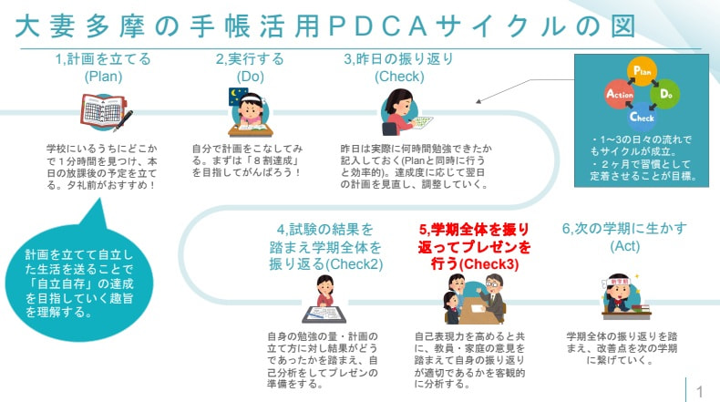 大妻多摩では学期末の三者面談を年に2~3回実施していますが、面談が生徒の主体性や「自立自存」の涵養を促す場となることを目指しています。そこで生徒は三者面談の場でフォーサイト手帳を開き、期末考査に向けた学習の振り返りを教員と保護者の方に向けてプレゼンしています。フォーサイト手帳に書き込まれている内容は自分の学習の足跡であるため振り返りがしやすく、それを踏まえた長期休み期間中の学習計画を練ることができ、ここにPDCAサイクルが成立します。教員はプレゼンを踏まえて質問を行ったり、学習の改善を提案できるため、三者面談をより有意義な時間にすることができます。