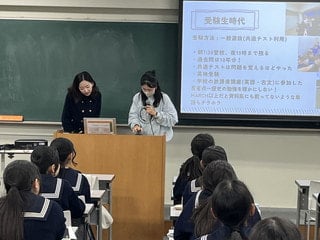 経済学部のNさんは学部のプログラムを活用した上海への語学・経済学研修留学、文学部のMさんもフランスへの語学留学について語ってくれました。おふたりが口を揃えて言っていたのは「これからの時代は、英語はできてあたりまえ」ということです。生徒たちはさらっと発せられた現代の大学生の新常識に面食らっていた様子でしたが、おふたりのお話を聞くうちに「ああ、英語はこれからの時代を生きるために絶対に必要なものなんだ」ということを実感させられた様子でした。「英検は絶対に取っておきましょう!高校1年生も、中学3年生も今のうちからです。2級以上が目標で、達成したら準1級にもどんどんチャレンジしてください」という旨のアドバイスをしていただきました。