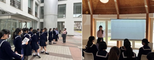 ご講演を務めてくださったのはSFCの元 環境教育学部 准教授・現 岡山理科大学 教育推進機構 教授の長谷部葉子先生です。また、本校の卒業生である大学4年生のIさんと、そのご学友で同研究室に所属するMさんにもキャンパス案内をしていただきました。