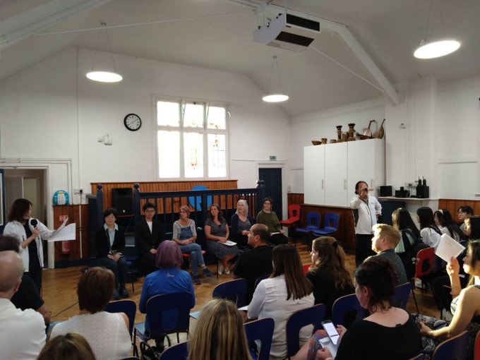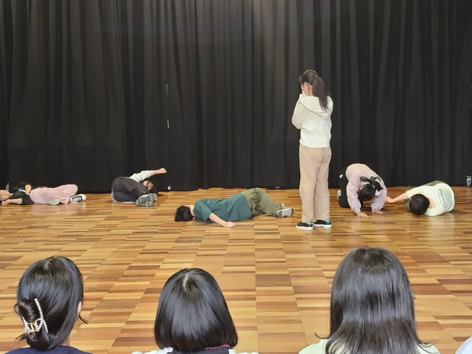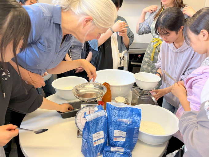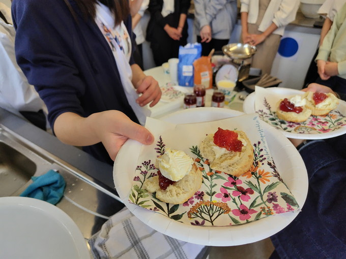スコーンはEnglishTeachersが作り方を指導してくださり、先生によってはレシピとは少し違う家庭の味の分量で作っていたのが印象的でした。ドラマレッスンは自己表現を学ぶ授業で、イギリスでは大学での専攻になっているほどポピュラーな科目だそうです。動物の真似をする簡単なゲームから始まり、最後には寸劇まで披露できました。