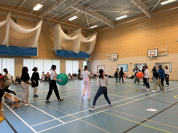 4日目の午後は、イギリスの生徒とスポーツ大会をしました。日本とイギリスの生徒が混合チームを作り、二人三脚や綱引き、縄跳び、バスケットボールなどを通して交流を深めました。